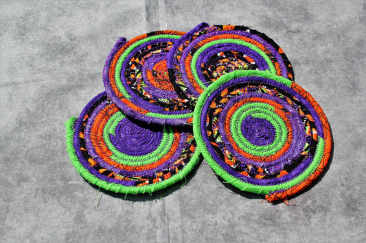 Halloween Coasters Set of 4, Oversized Quilted Fabric Coasters, Rolled Rope Circle Coasters, Fall Clothesline Coasters, Autumn Coaster Gift