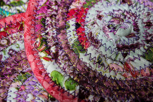 Colorful Floral Clothesline and Fabric Coaster Set of 4, Oversized Quilted Circle Coaster, Rolled Rope Large Coaster, Quilted Kitchen Trivet