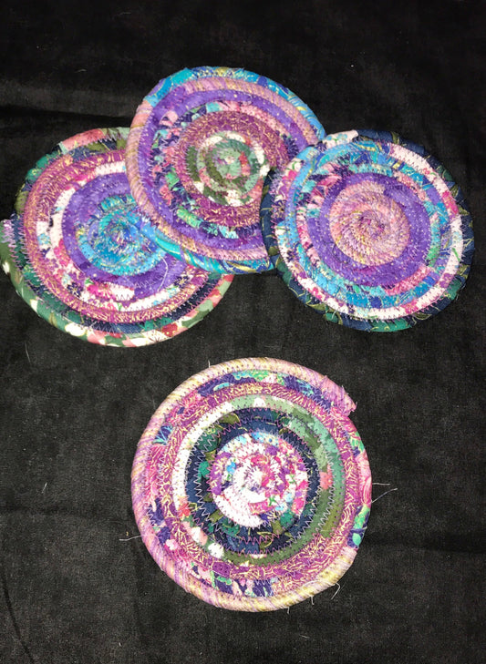 Pink and Blue Clothesline and Fabric Coaster Set of 4, Oversized Quilted Circle Coaster, Rolled Rope Fabric Large Coaster, Purple Trivets