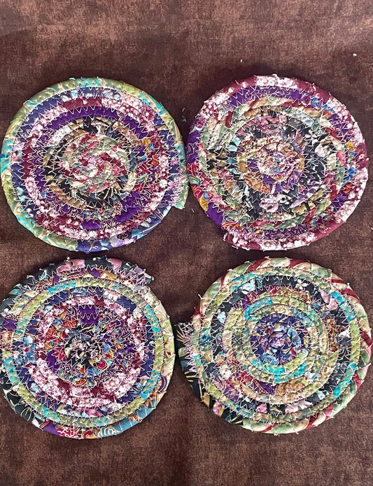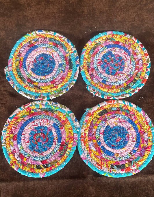 Clothesline and Fabric Coasters Set of 4, Oversized Quilted Circle Coasters, Rolled Rope Fabric Large Coasters, Floral Coiled Trivets Gift