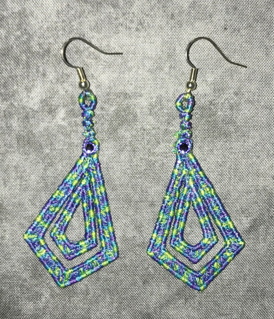 Purple and Green Swarovski Earrings, Blue Embroidered Earrings, Purple Lace Earrings, Embroidery Jewelry, Green and Blue Dangle Earrings