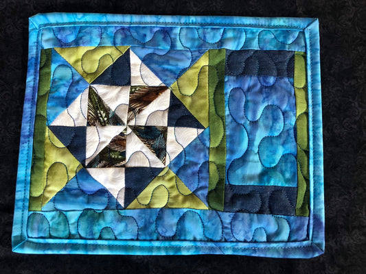 Blue and Green Mug Mat, Handcrafted Snack Mat, Colorful Quilted Placemat, Quilt Block Mug Rug, Teal Coaster, Quilted Kitchen Tableware Gift