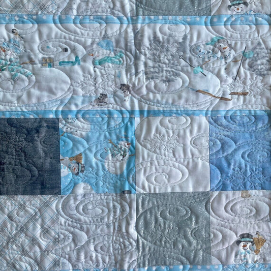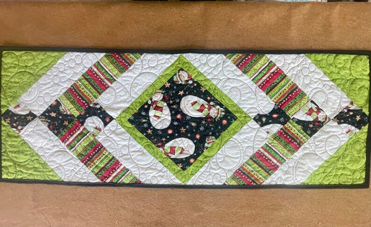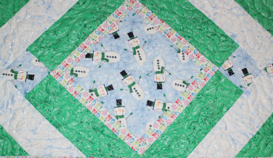 Snowman Table Runner, Green Blue Holiday Quilted Runner, Christmas Snowmen Table Cover, Noel Tableware, Christmas Kitchen Table Protector