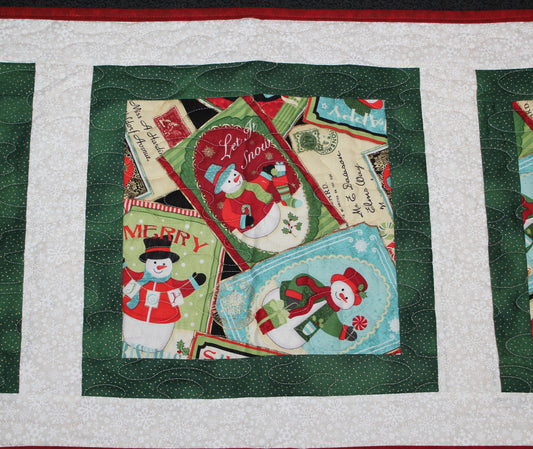 Snowman Post Card Table Runner, Holiday Snow Quilted Runner, Green and Red Christmas Table Cover, Snowflakes and Snowman Christmas Tableware
