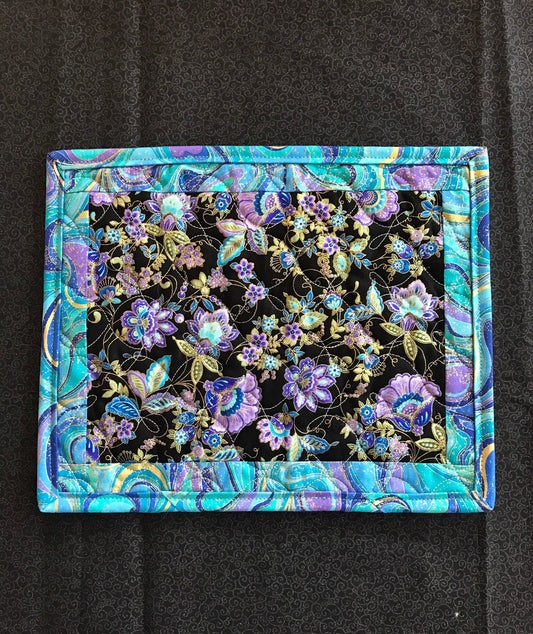 Teal and Purple Quilted Mug Mat, Floral Candle Mat, Quilted Snack Mat, Handcrafted Placemat, Colorful Swirls Flower Mug Rug, Kitchen Coaster