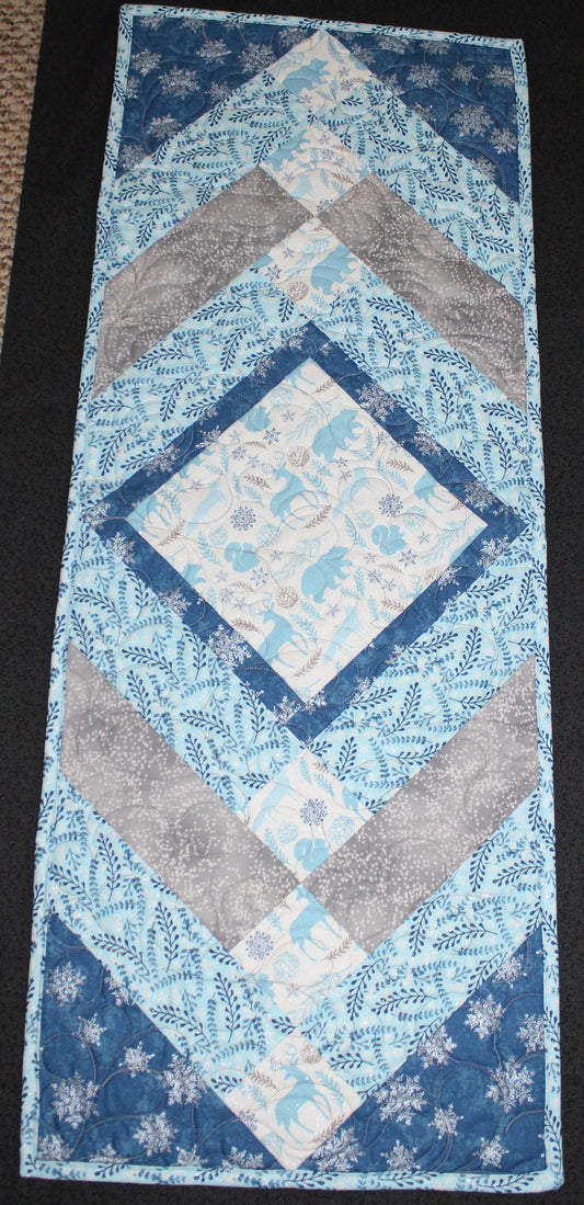 Forest Animals Table Runner, Holiday Quilted Runner, Winter Deer Table Cover, Blue and Gray Gift Tableware, Snow Kitchen Table Protector
