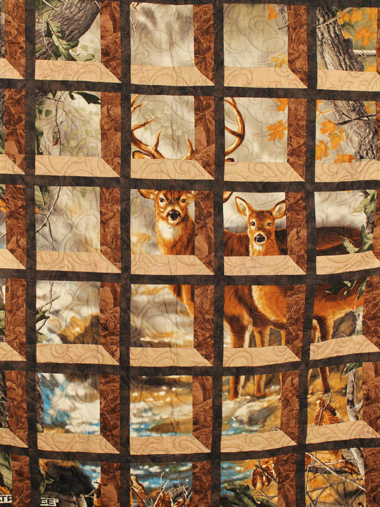 Deer in the Woods Twin Size Quilt, Hunting Lap Quilt, Camouflage Throw Blanket, Leaf and Deer Gift Bed Quilt, Winter Oversize Throw Quilt