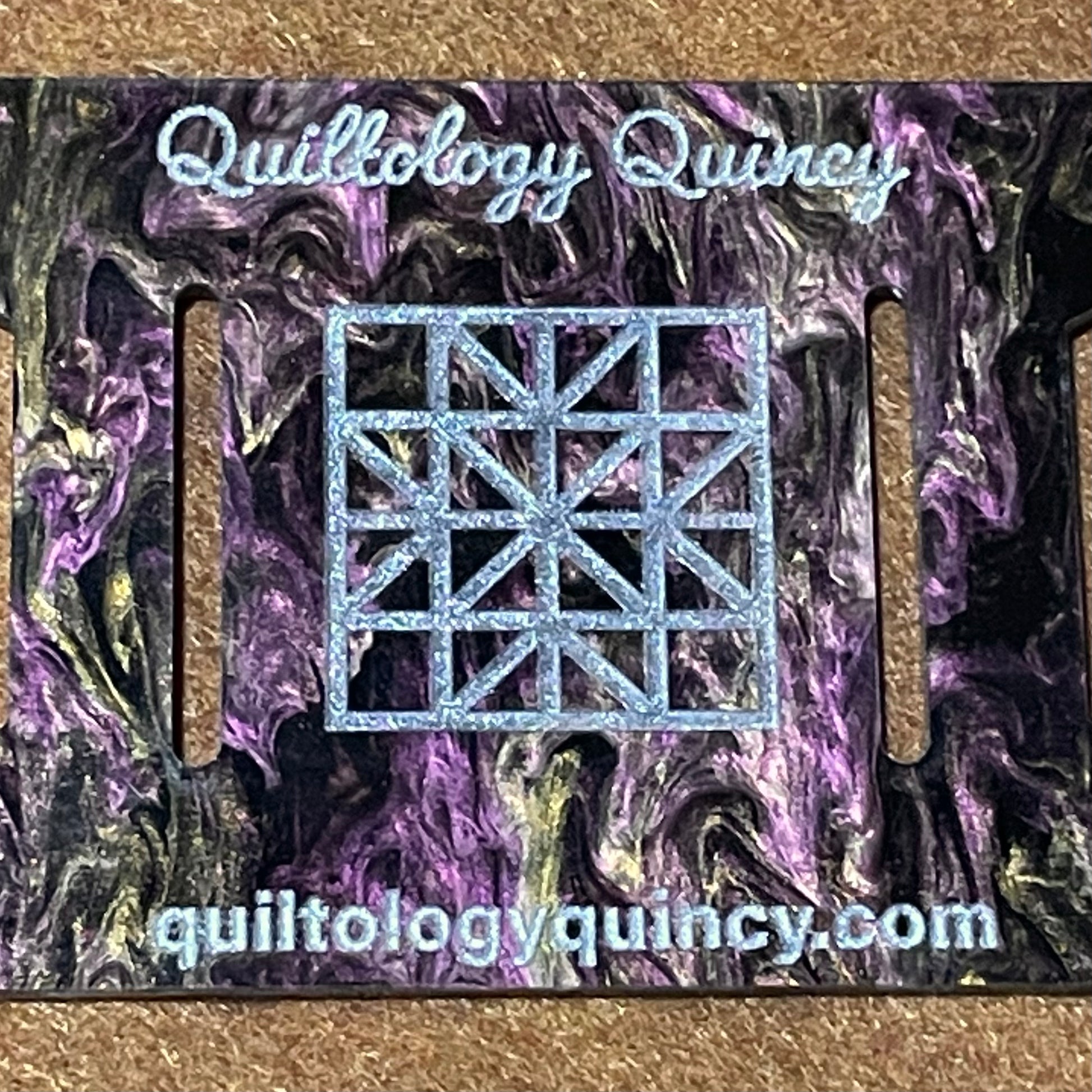 The tools measure 3 x 5.5 inches. Each tool comes engraved with a sparkling white quilt block for extra fun. The spools are designed to hold even a king size roll of binding! Just prep your binding like normal, lace one end through the two slits on the spool and wrap away. Keep everything perfectly neat and tidy by securing the end with pin.