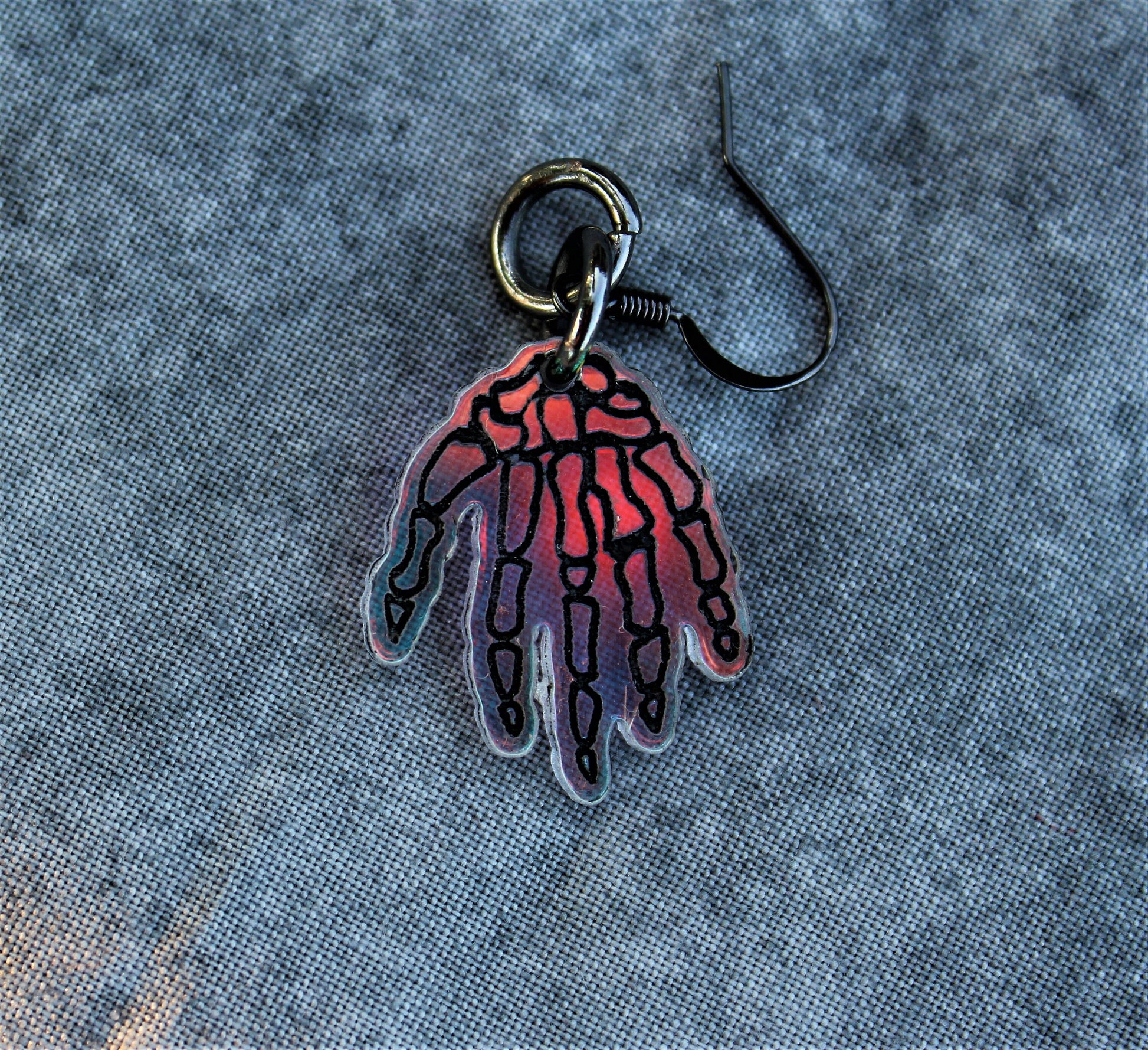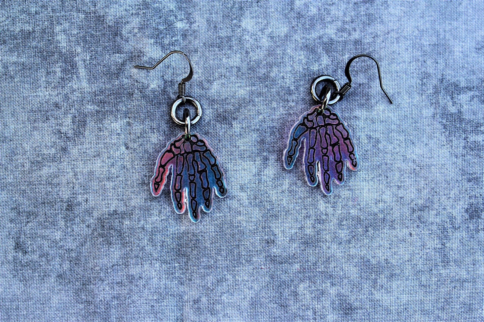 Enough of their stressful backstory, let's talk about the wonderful skeleton hand earrings that you see in this listing. These earrings are made by cutting and etching a hand-drawn original design out of a sheet of acrylic. The design featured on these earrings is a skeleton hand with detailed bones. As you have probably gathered, the earrings aren't cut from any old acrylic. They are made from a beautiful clear acrylic with a holographic finish. Personally, I feel that the holographic looks a little bit more like a shiny purple/blue color-shifting. Although the appearance of the acrylic is difficult to capture on camera, the pictures do an accurate job of showing it. To get the unique black detailing on the earrings, metallic black paint is rubbed into etching on the acrylic by hand. Any excess is wiped off, leaving crisp lines that make the earrings pop. Matching jump rings and ear wires are added to each earring, which are made of nickel-free metal.