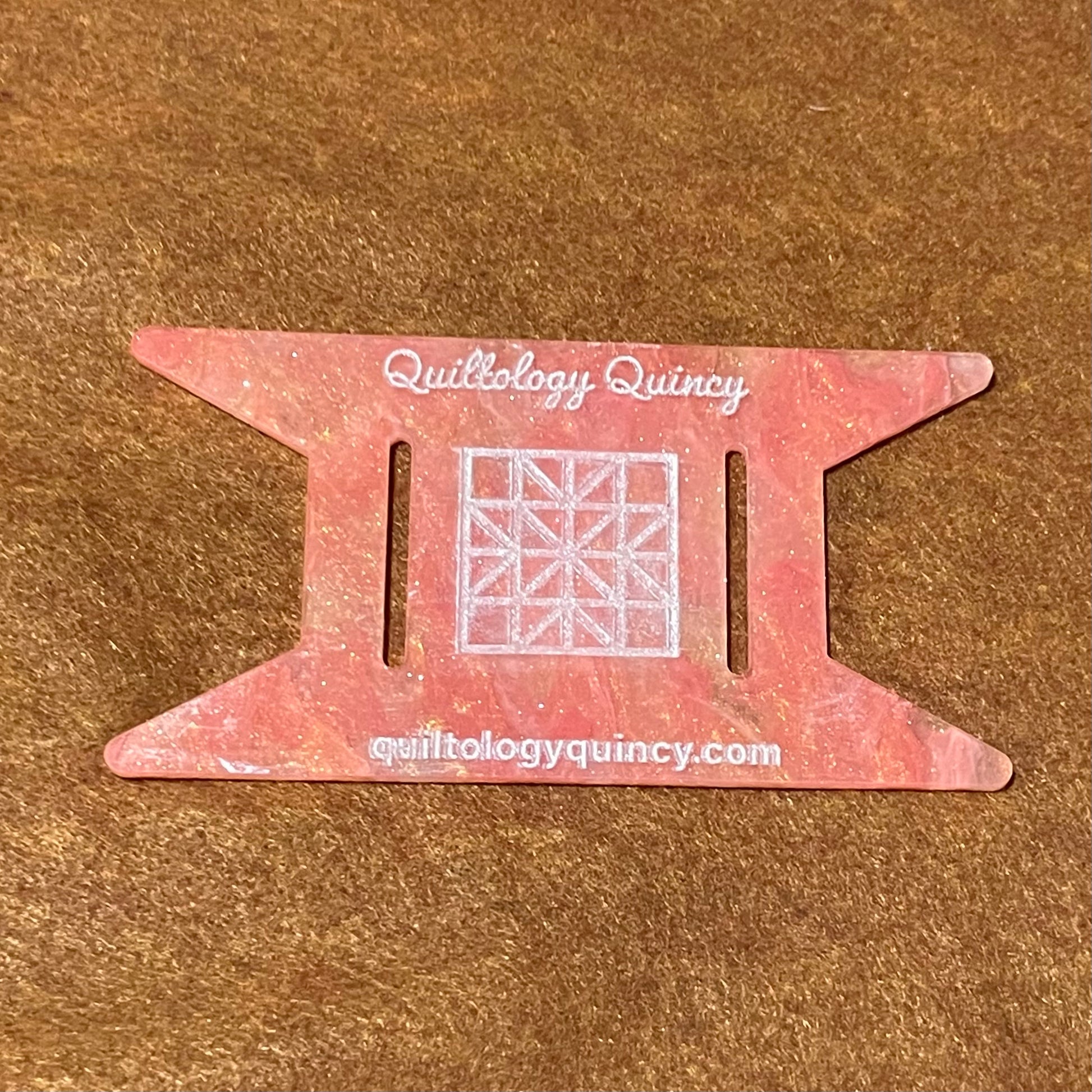 The tools measure 3 x 5.5 inches. Each tool comes engraved with a sparkling white quilt block for extra fun. The spools are designed to hold even a king size roll of binding! Just prep your binding like normal, lace one end through the two slits on the spool and wrap away. Keep everything perfectly neat and tidy by securing the end with pin.