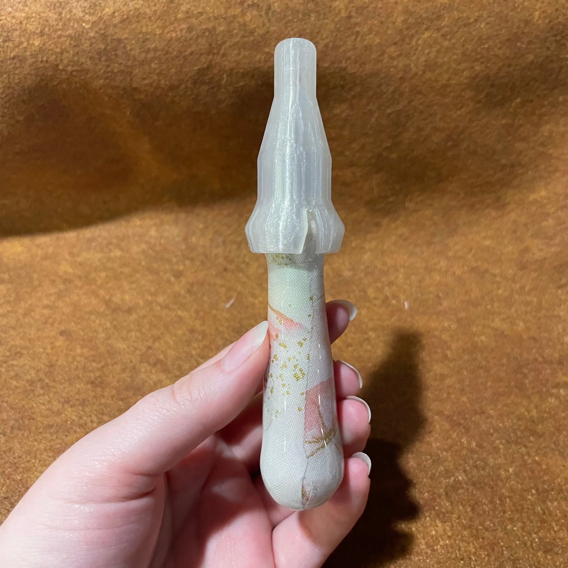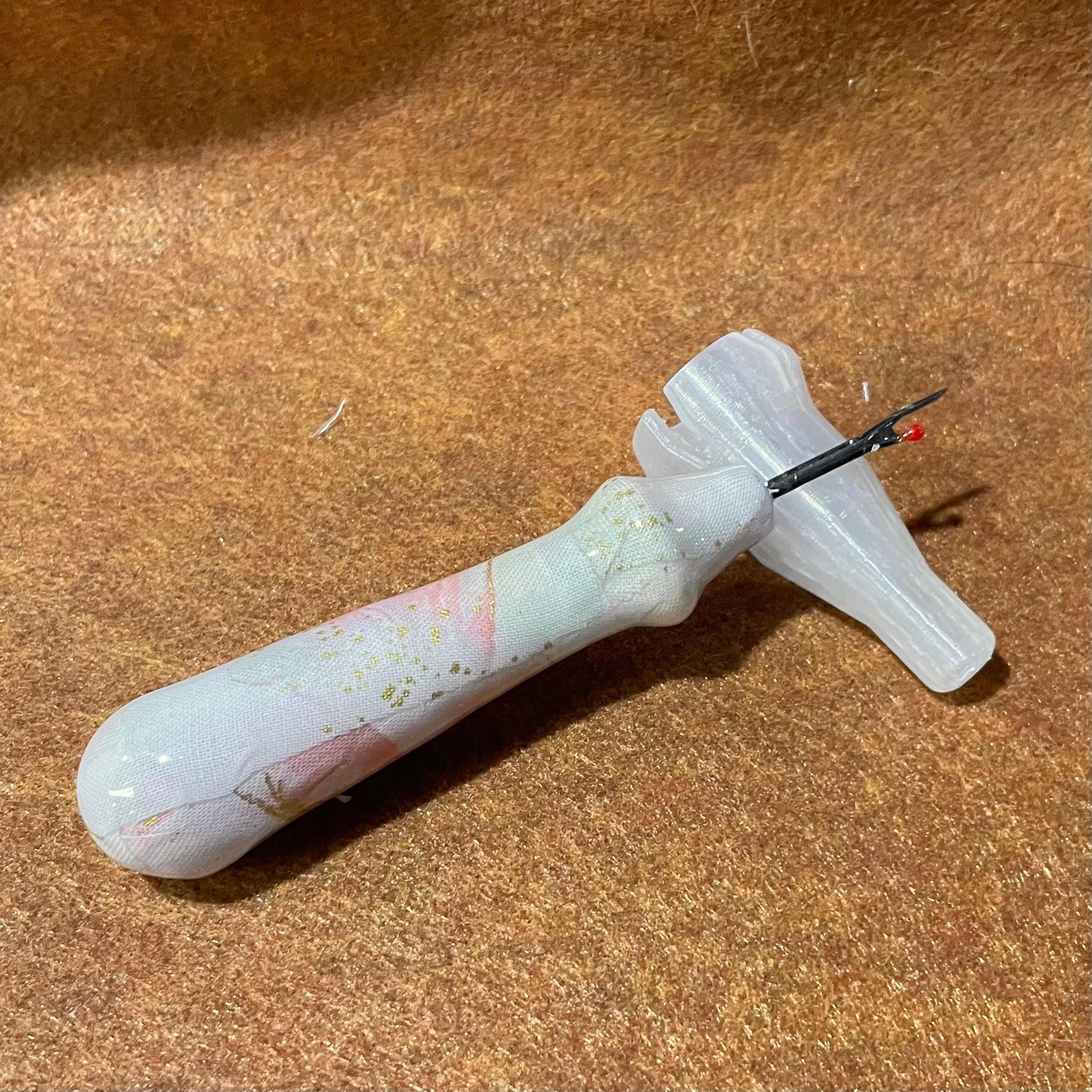 Each seam ripper features a lightweight plastic base that is prepped, carefully wrapped in cotton quilting fabric, and sealed with UV resin. The final product is a comfortable weight with a smooth finish. The large, ergonomic design is perfect for arthritic hands that need extra support. All seam rippers ship with a 3D printed flexible cap that is custom designed to perfectly fit our rippers.