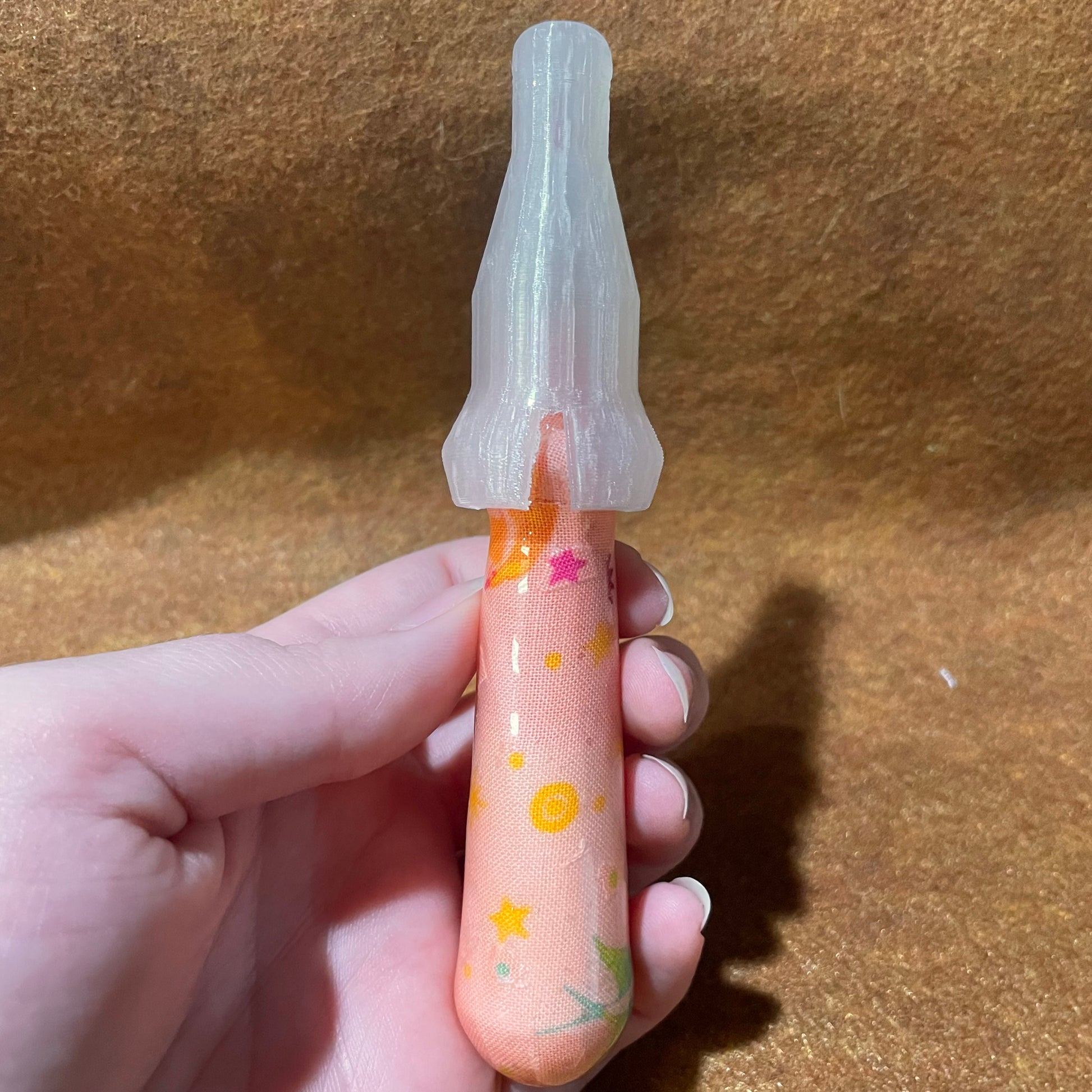 Each seam ripper features a lightweight plastic base that is prepped, carefully wrapped in cotton quilting fabric, and sealed with UV resin. The final product is a comfortable weight with a smooth finish. The large, ergonomic design is perfect for arthritic hands that need extra support. All seam rippers ship with a 3D printed flexible cap that is custom designed to perfectly fit our rippers.