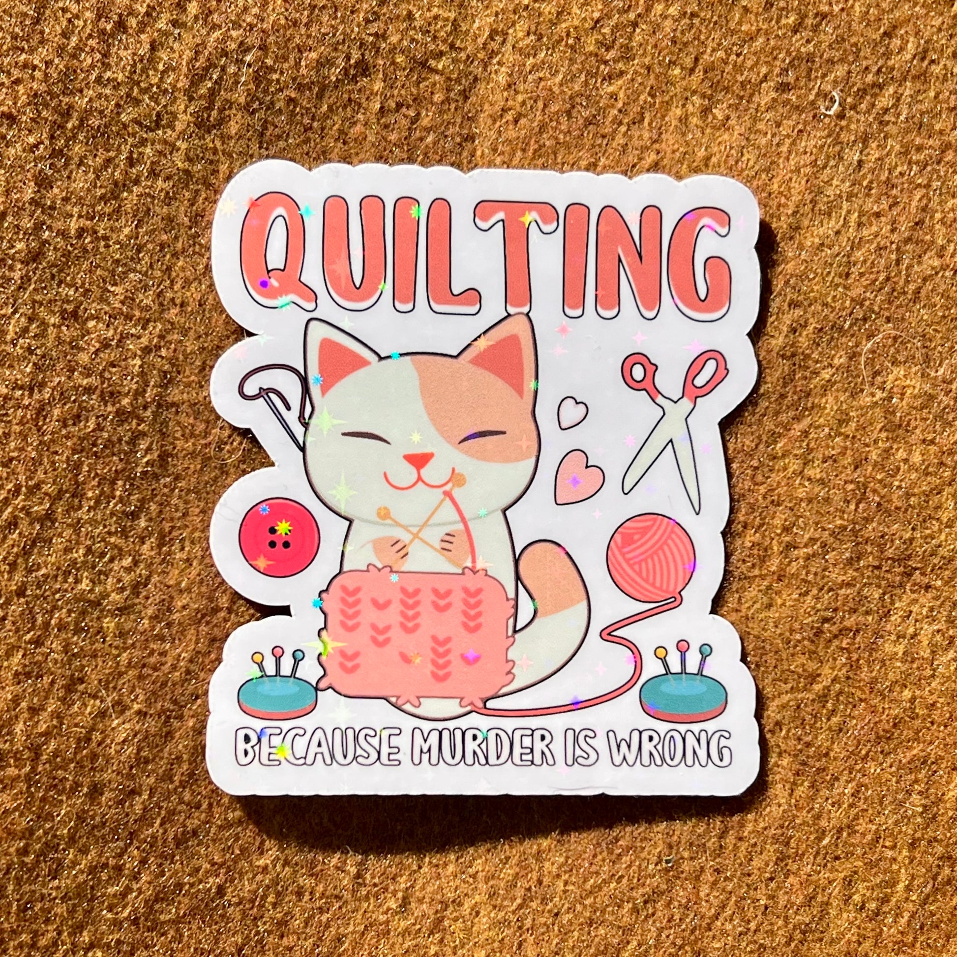 Let everyone know there is a quilter around with these adorable vinyl quilting stickers. The stickers are durable, waterproof, and ready to stick on the surface of your choice! Each sticker measures 3 inches on its longest side and has a holographic glitter topper. Glitter topper style will vary.